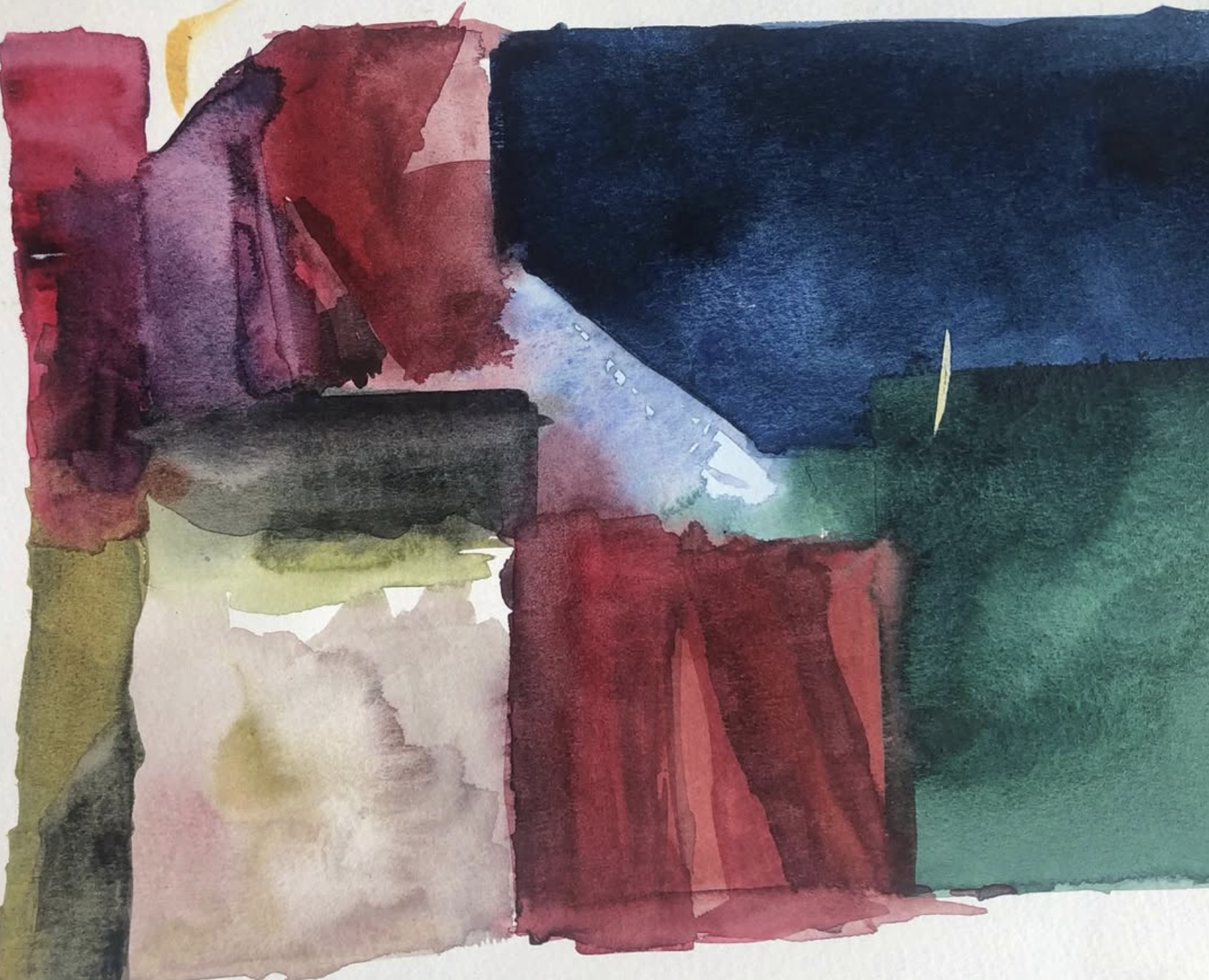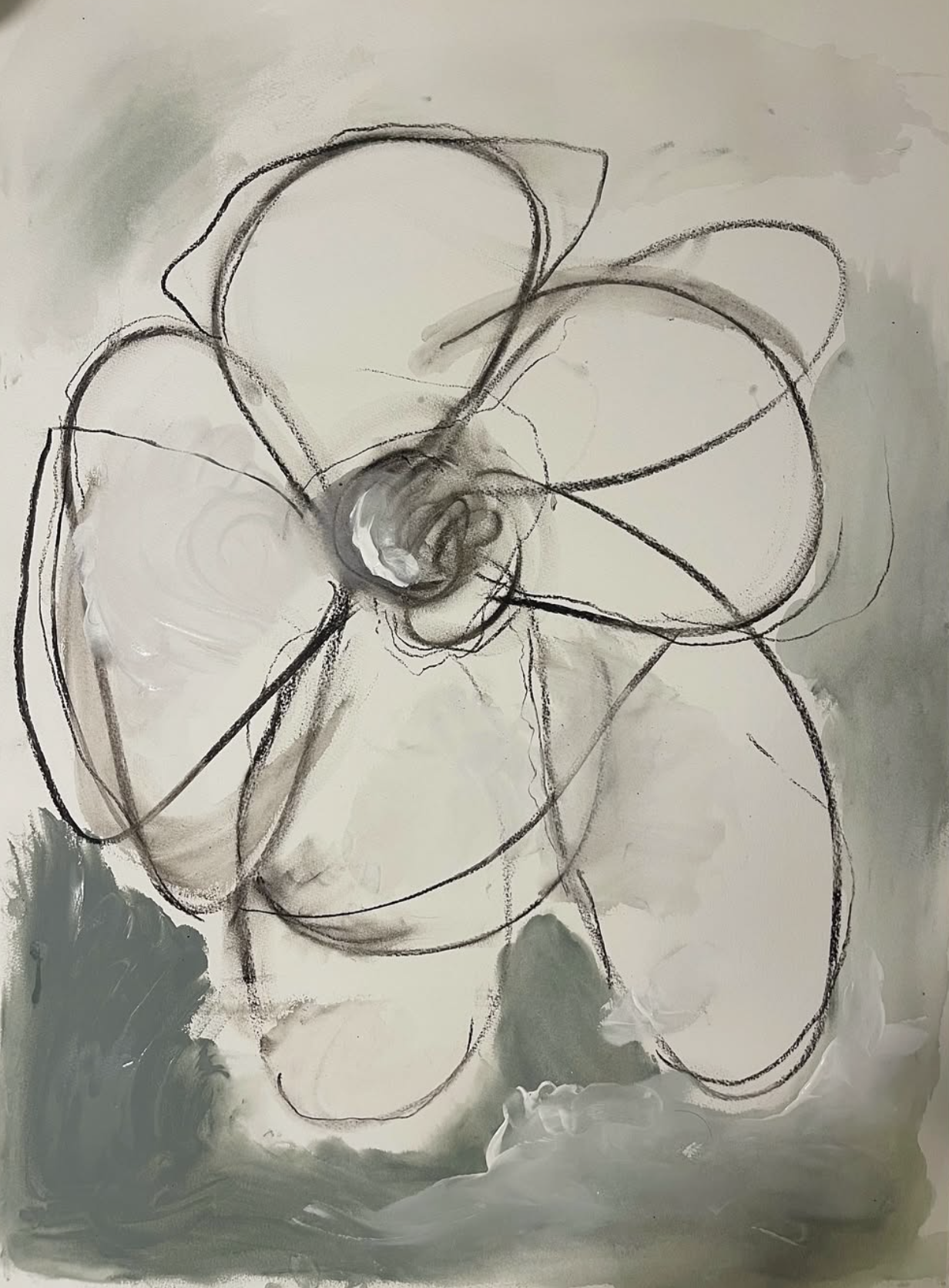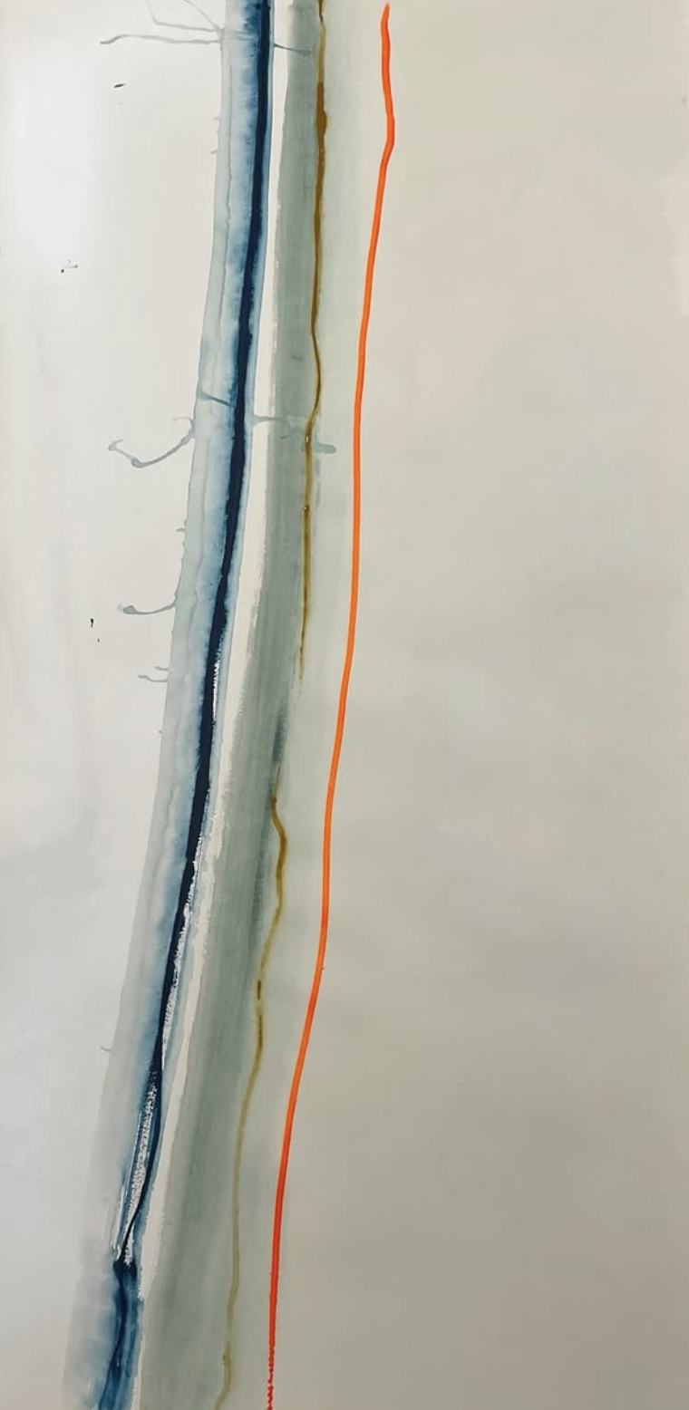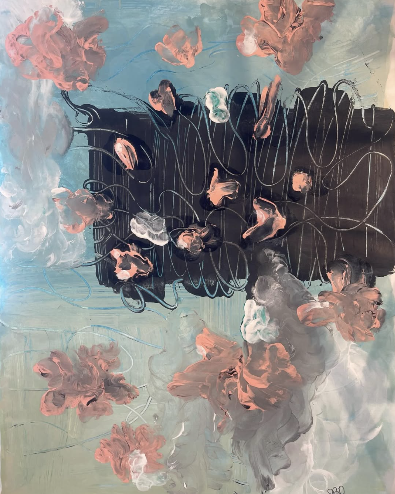 I build in layers using watercolor, acrylic, and charcoal, allowing transparency and saturation to move against one another until the composition settles into something honest. Some marks are intentional, others arrive unexpectedly. I trust both.