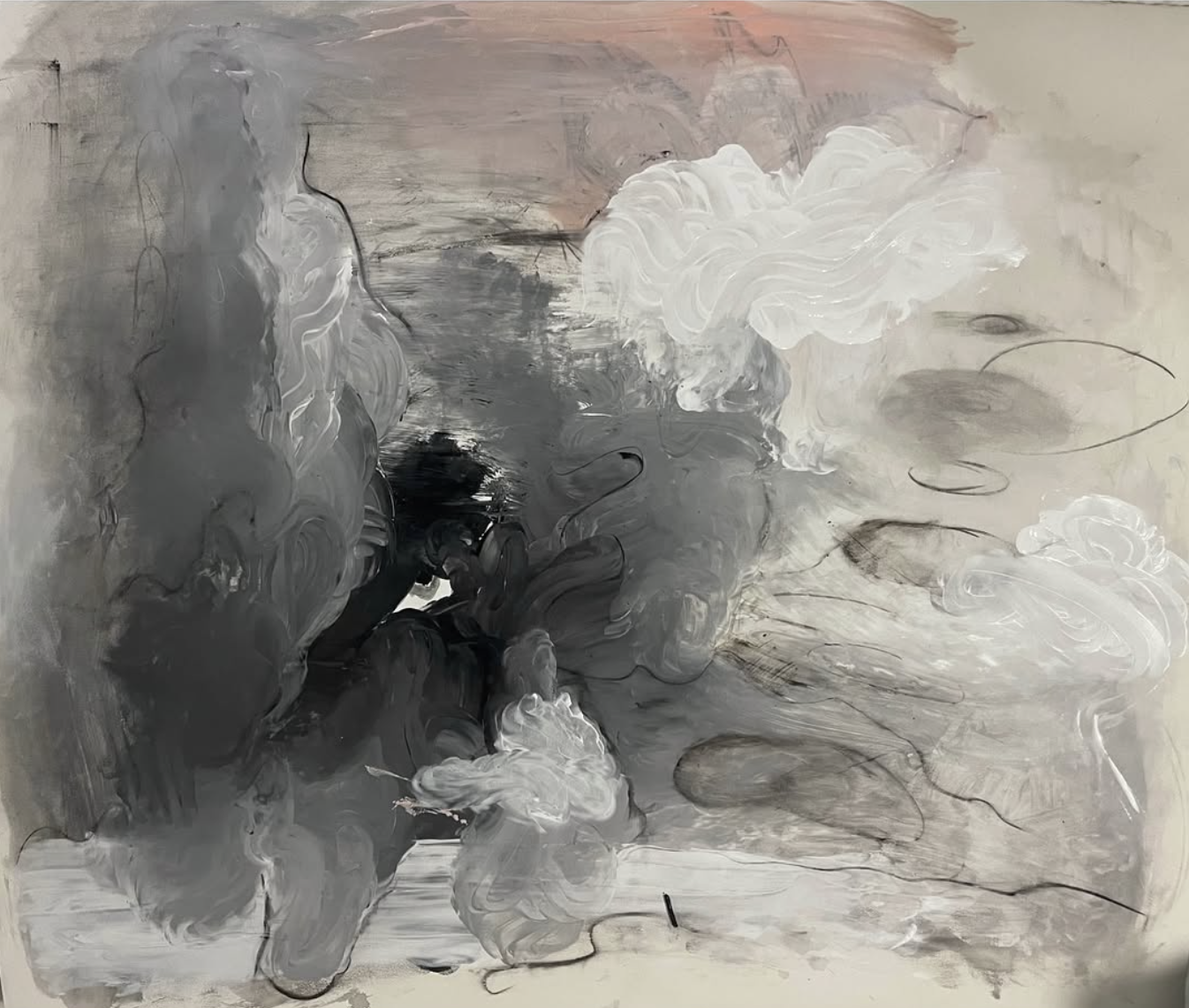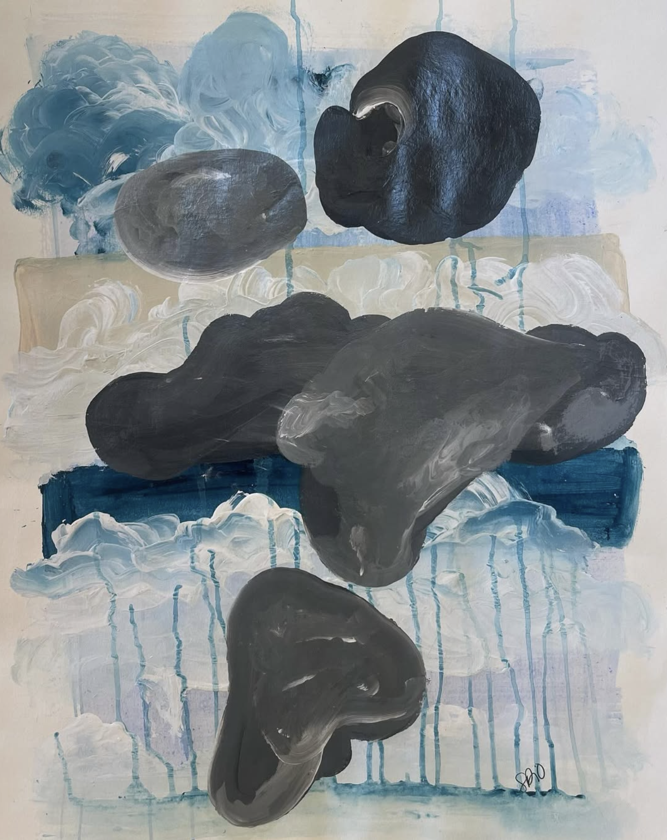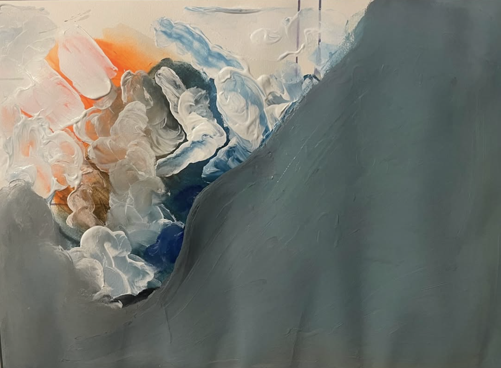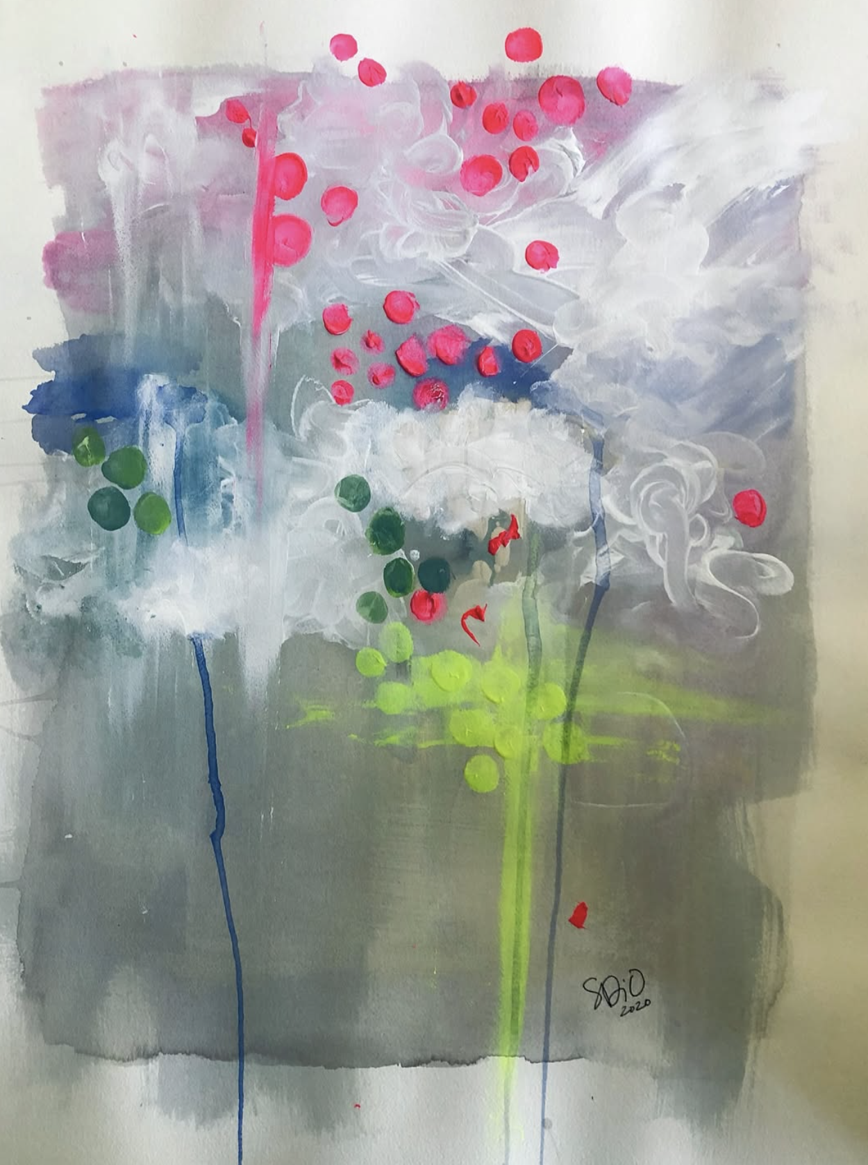 I build in layers using watercolor, acrylic, and charcoal, allowing transparency and saturation to move against one another until the composition settles into something honest. Some marks are intentional, others arrive unexpectedly. I trust both.